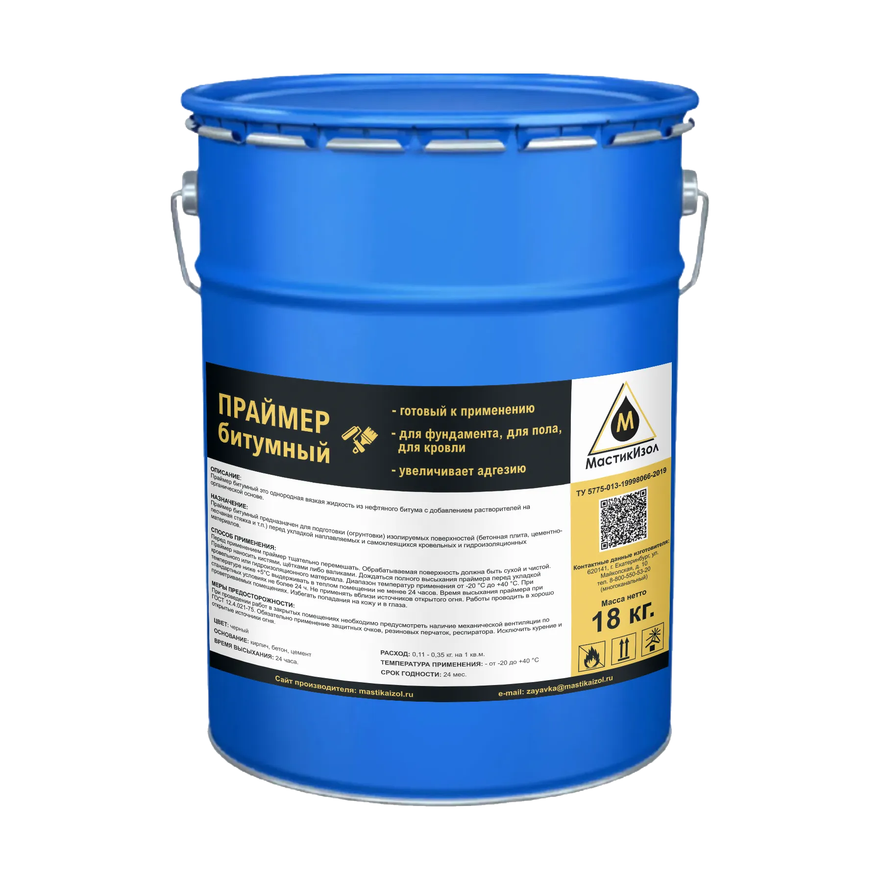 Продукт следует хранить в герметичной таре, в помещении с температурой от -30 до +50 градусов. Необходимо избегать воздействия влаги, прямых солнечных лучей и близости с источниками тепла и открытого огня. Нельзя хранить битумный праймер в жилых помещениях рядом с продуктами питания. Также стоит беречь его от детей. При правильном хранении, в заводской упаковке, срок годности составляет 24 месяца.Характеристики